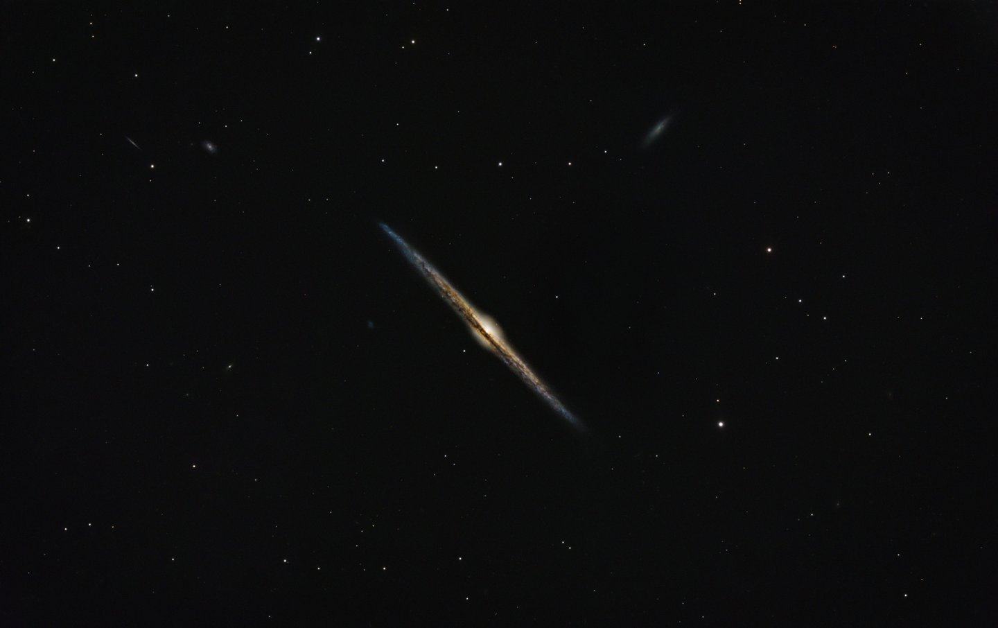 NGC 4565, commonly known as the Needle Galaxy, is an edge-on spiral galaxy located in the constellation Coma Berenices, about 40 million light-years from Earth. Its distinctive appearance, with a long, narrow shape and prominent dust lane, resembles the form of a needle, hence its nickname. NGC 4565 is a striking example of an edge-on spiral galaxy, with its flat disk and central bulge clearly visible from this perspective. The dark band of interstellar dust running along the galaxy's center gives it a dramatic and beautiful contrast, making it a favorite among astrophotographers. Despite being relatively faint, it is visible with telescopes, and its unique orientation provides a clear view of the galaxy's structure.
