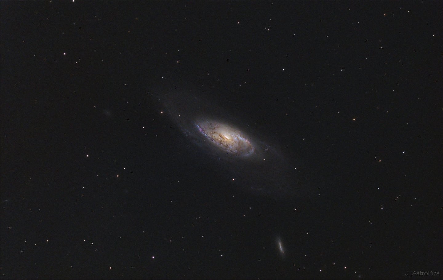 M106 is a barred spiral galaxy located in the constellation Canes Venatici, about 25 million light-years from Earth. It is notable for its unique combination of features, including a Seyfert 2 active galactic nucleus (AGN) at its center, which is responsible for emitting strong X-rays and radio waves. The central region of M106 houses a supermassive black hole that is actively accreting material, making it one of the most studied galaxies in terms of AGN activity. M106 also has distinct spiral arms and a central bar, with regions of intense star formation and hydrogen gas emission. Its active nucleus and unusual structure make M106 an interesting and dynamic galaxy, both for professional astronomers and astrophotographers.