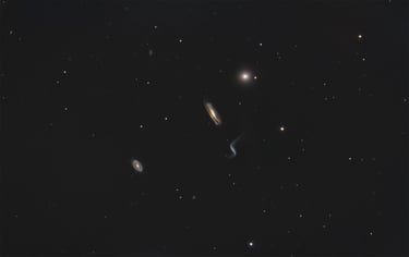 The Hamburger Galaxy (NGC 3628) is a spiral galaxy located in the constellation Leo, about 35 million light-years from Earth. It is part of the Leo Triplet, a group of three galaxies that includes the famous Messier 65 and Messier 66. The Hamburger Galaxy earned its name due to its resemblance to a hamburger, with the central bulge and the dark dust lane resembling the "bun" and the outer spiral arms forming the "meat." This galaxy is a beautiful example of a barred spiral galaxy and is a fascinating object for astrophotographers due to its detailed structure and the interaction with its neighbors in the Leo Triplet.