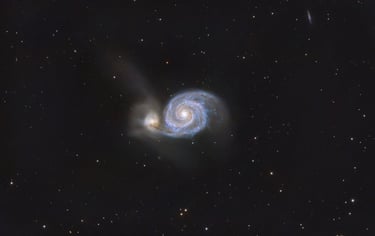 M51, commonly known as the Whirlpool Galaxy, is a stunning spiral galaxy located in the constellation Canes Venatici, approximately 23 million light-years from Earth. It is one of the most famous interacting galaxies in the night sky, best known for its striking, well-defined spiral arms and its close companion, NGC 5195. The gravitational interaction between the two galaxies enhances M51’s spiral structure, triggering waves of star formation that give the arms their bright, textured appearance. As a classic example of a grand-design spiral galaxy, M51 is a favourite target for astrophotographers, revealing intricate dust lanes, glowing star-forming regions, and subtle colour variations. At its core lies a supermassive black hole, contributing to its active nature. Under dark skies, M51 can be glimpsed with small telescopes, while larger instruments reveal its iconic whirlpool shape in impressive detail.