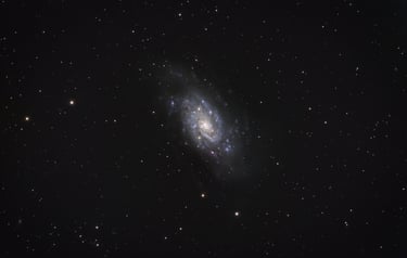 NGC 2403 is a beautiful spiral galaxy located in the constellation Camelopardalis, about 10 million light-years from Earth. It is a member of the M81 group of galaxies, which includes several other prominent galaxies like M81 and M82. NGC 2403 is a relatively bright and well-defined spiral galaxy with a prominent central bulge and well-structured spiral arms. These arms are rich in star-forming regions, making it a fascinating target for astronomers studying stellar evolution and galactic structure. NGC 2403's distance from Earth and its relatively high surface brightness make it visible in smaller telescopes, though it remains a popular target for astrophotographers due to its detailed and vibrant spiral structure.