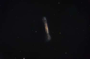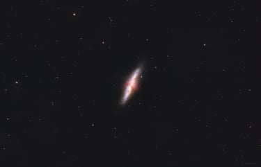 M82, also known as the Cigar Galaxy, is a starburst galaxy located in the constellation Ursa Major, approximately 12 million light-years from Earth. Its unusual, cigar-like shape—elongated and narrow—gives it its nickname. M82 is known for its intense star formation activity, which is occurring in the galaxy’s central region. This starburst activity is likely caused by an interaction with its neighboring galaxy, M81, which has disrupted M82's structure and triggered the rapid formation of new stars. The galaxy is also notable for its outflows of gas and dust being expelled from its center, creating striking images. M82 is a popular target for astronomers due to its unique structure and active star formation, making it a fascinating object for both study and astrophotography.