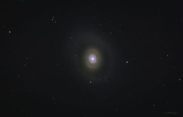 M94, also known as the Cats Eye Galaxy, is a spiral galaxy located in the constellation Canes Venatici, about 16 million light-years from Earth. This galaxy is known for its striking and well-defined central structure, which resembles the shape of a cat’s eye, hence its nickname. M94 features a large, bright central bulge surrounded by a ring of star formation, which is a distinctive characteristic of this galaxy. The central region contains a dense cluster of stars and an active galactic nucleus, while the outer disk is home to a prominent star-forming ring. M94's combination of features makes it an intriguing object for both amateur and professional astronomers, offering a clear view of a galaxy with a central ring structure.