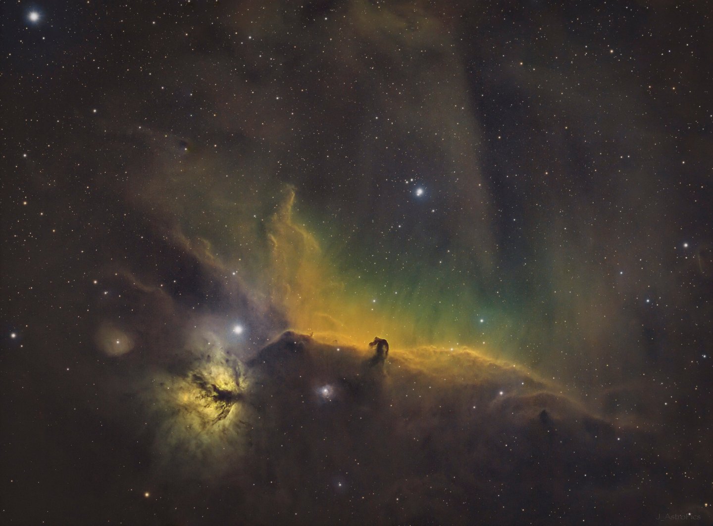 The Horsehead Nebula (Barnard 33) and the Flame Nebula (NGC 2024) are two stunning dark nebulae located in the constellation Orion. The Horsehead Nebula is a famous dark molecular cloud, shaped like a horse's head, and lies just south of the bright star Alnitak, the easternmost star in the Orion’s Belt. This iconic feature is a site of active star formation, where the surrounding gas and dust are being illuminated by nearby stars. Just to the north, the Flame Nebula is a bright emission nebula, lit up by the energetic radiation from the young star HD 210839. Together, these nebulae form one of the most photogenic and dynamic regions in the night sky.