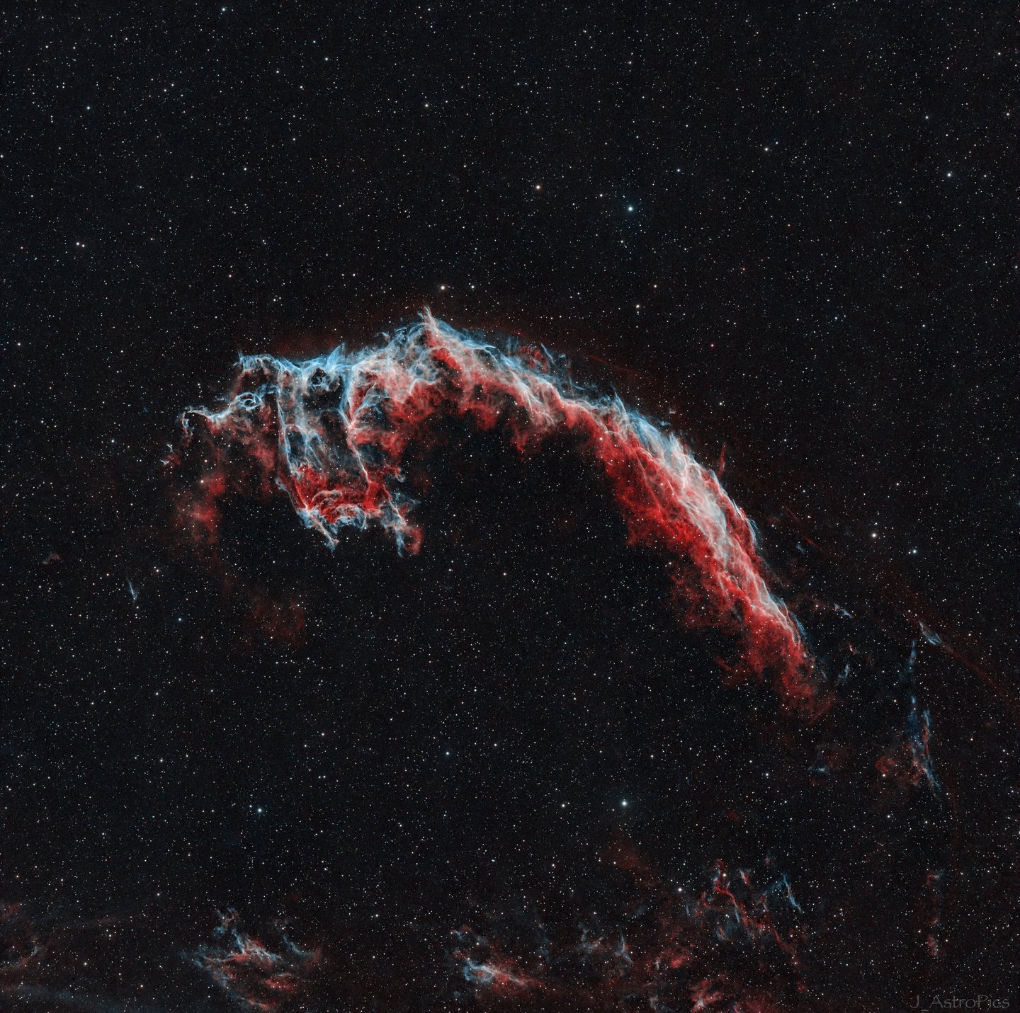 The Eastern Veil Nebula, also known as NGC 6992, is part of the larger Veil Nebula supernova remnant located in the constellation Cygnus, about 2,000 light-years from Earth. This striking nebula is the result of the explosion of a massive star, and it consists of delicate, filamentary structures of gas and dust that were expelled during the supernova event. The Eastern Veil Nebula is particularly famous for its intricate, glowing tendrils of ionized gas, which shimmer in hues of blue and red. Its wispy, ethereal appearance, coupled with its proximity to the Western Veil Nebula, makes it one of the most photogenic regions of the sky and a favorite among astrophotographers.