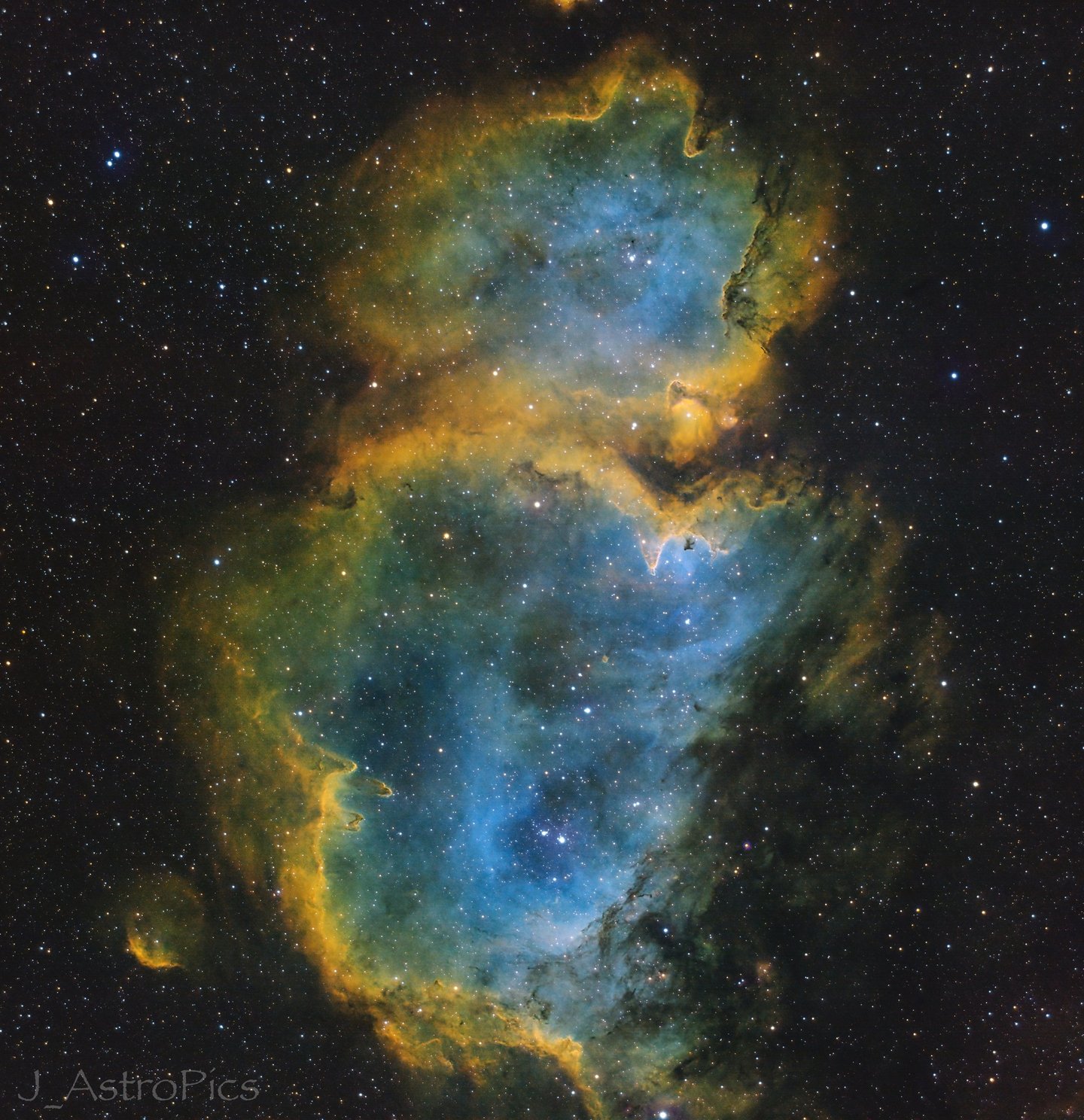 The Soul Nebula (NGC 6871) is a large emission nebula located in the constellation Cassiopeia, about 6,000 light-years away from Earth. This nebula, often paired with the nearby Heart Nebula, is a region of intense star formation, where new stars are being born from the surrounding gas and dust. The Soul Nebula is rich in vibrant hydrogen emissions, which create stunning, colorful imagery. Its name comes from its intricate and vast structure, which, when viewed in certain ways, resembles a cosmic "soul" or spiritual essence. The nebula is a favorite target for astrophotographers due to its detailed filaments of gas and the stunning contrast between the dark dust clouds and the glowing gas.