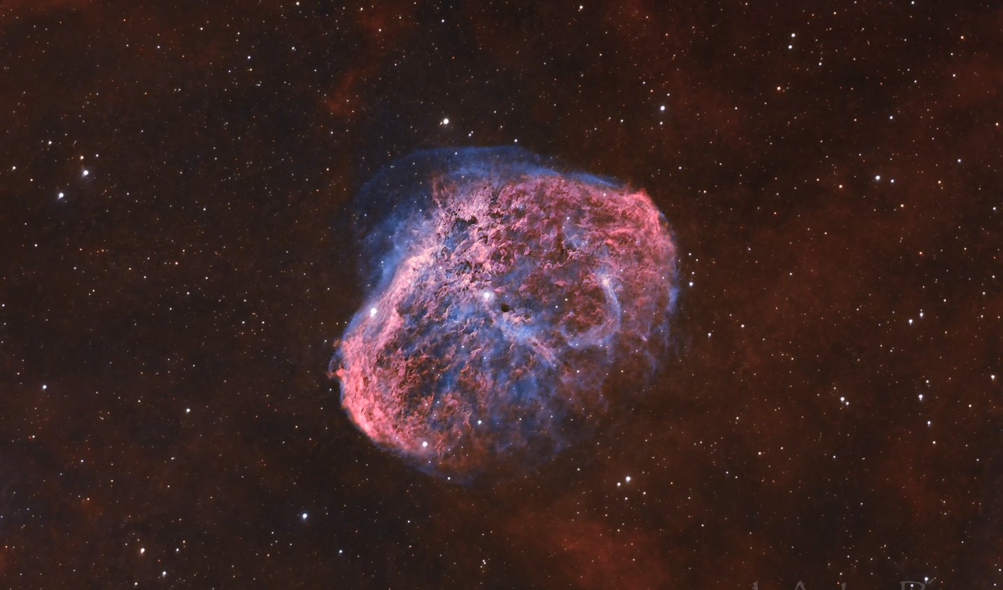 NGC 6888, or the Crescent Nebula, is an emission nebula located in the constellation Cygnus, about 5,000 light-years away. This nebula is the remnant of a star that exploded as a Wolf-Rayet star, shedding its outer layers in a powerful stellar wind. The nebula’s distinct crescent shape is formed by the interaction of the expelled gas with the surrounding interstellar medium. The nebula glows in vibrant red hues due to the ionization of hydrogen gas, and its detailed structure provides an intriguing glimpse into the lifecycle of massive stars.