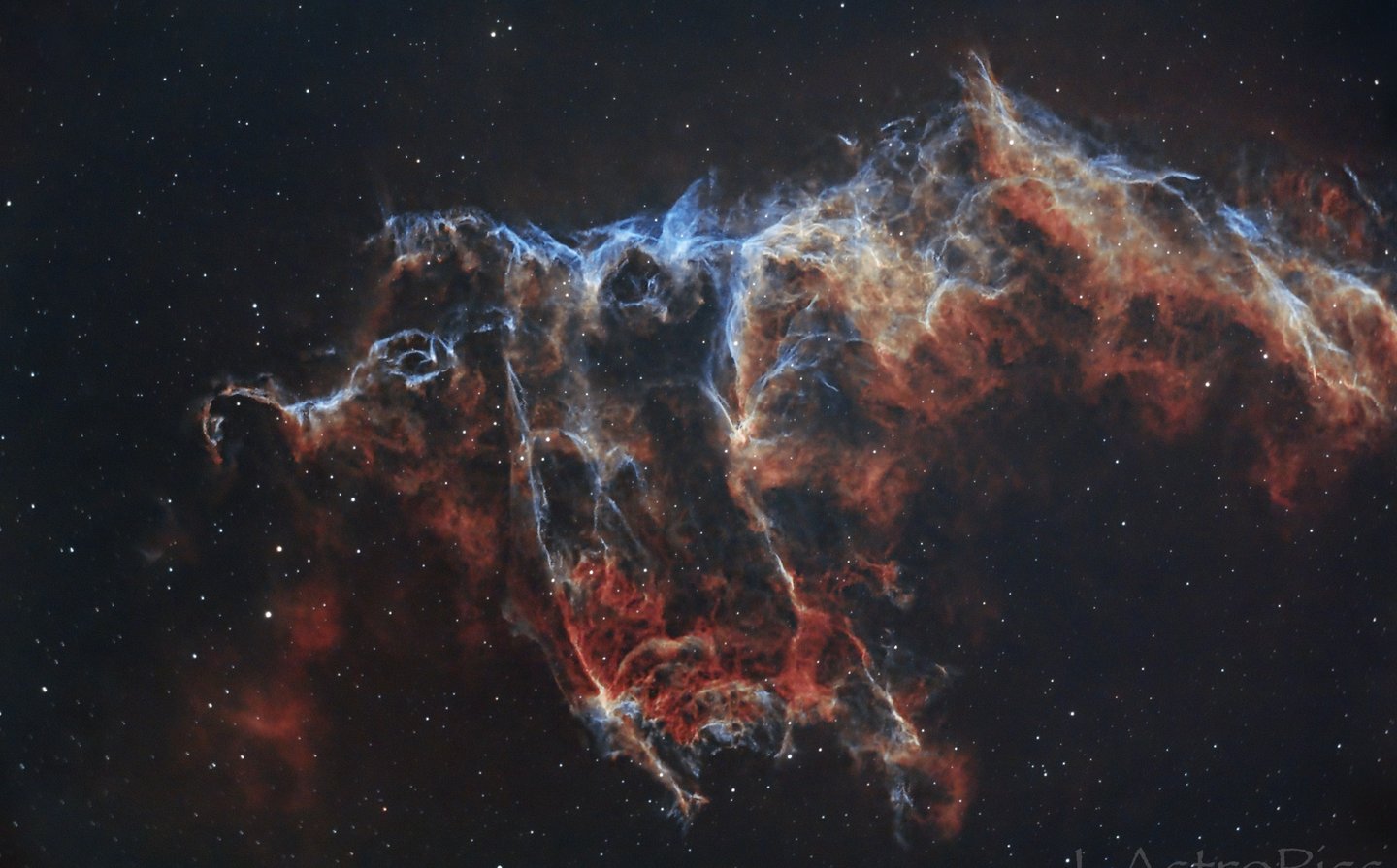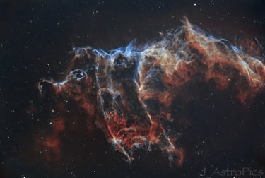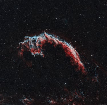 The Western Veil Nebula, also known as NGC 6960, is a beautiful section of the larger Veil Nebula supernova remnant, located in the constellation Cygnus, about 2,000 light-years from Earth. This nebula is the remnants of a star that exploded in a supernova, and its intricate, wispy filaments of gas and dust form a stunning cosmic structure that is often described as resembling the "veil" of a star. The Western Veil Nebula is particularly known for its bright, detailed filaments of ionized gas, which glow in shades of blue and red, and its dark streaks of interstellar dust that add to the nebula's striking contrast. This nebula is a popular target for astrophotographers due to its complexity and vibrant appearance.