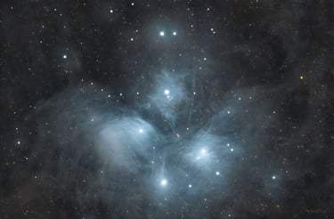 M45, commonly known as the Pleiades or the Seven Sisters, is an open star cluster located in the constellation Taurus, about 440 light-years from Earth. This iconic cluster is made up of hot, young stars that are surrounded by a faint nebula of dust and gas. The Pleiades is one of the most famous and brightest star clusters in the sky, often visible to the naked eye. Despite its name, only six stars are typically visible without a telescope, with the seventh being a challenge to spot. The stars in the cluster are relatively young, and the surrounding nebula is a remnant from the stars' formation. The Pleiades is a stunning object both for casual skywatchers and astrophotographers, offering a rich field of bright stars and delicate gas clouds.