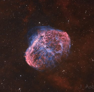 Simeis 147 (also known as the Spaghetti Nebula) is a supernova remnant located in the constellation Auriga, about 3,000 light-years from Earth. This fascinating nebula is the result of the explosion of a massive star that occurred thousands of years ago. The remnants of the supernova are spread out in long, filamentary structures that resemble strands of spaghetti, giving the nebula its name. The filaments are made up of ionized gas and dust, creating a stunning visual contrast with the surrounding star field. Simeis 147 is a relatively faint object, making it a challenging target for astrophotographers, but its intricate structure and complex morphology make it a rewarding subject for those who seek to capture the aftermath of a stellar explosion.