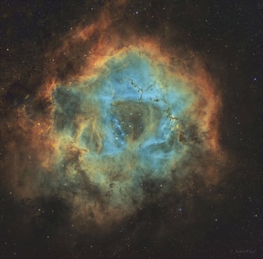 The Rosette Nebula (NGC 2237) is a large emission nebula located in the constellation Monoceros, about 4,500 light-years away from Earth. This beautiful nebula is a region of intense star formation, with the gas being ionized by the radiation from young, hot stars in the center of the nebula. The nebula's shape is reminiscent of a giant rose, with its bright, glowing edges and dark filaments of gas and dust. The central cluster of stars, known as NGC 2244, is responsible for much of the ionization and energy that makes the nebula so vibrant. The Rosette Nebula is a spectacular example of stellar birth and is a favorite among astrophotographers for its intricate structure and stunning colors.